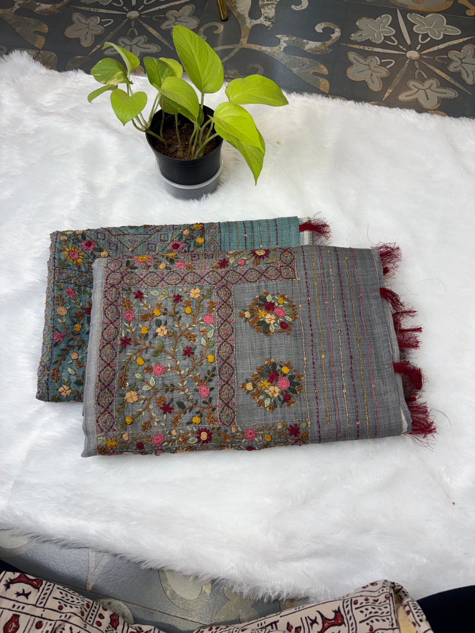 Pure linen sarees are celebrated for their comfort, lightweight feel, and impeccable texture, making them a go-to choice for all seasons. Adding Kanta work elevates them to a new level of sophistication, blending hand embroidery techniques with the natural elegance of linen fabric. The subtle patterns, intricate stitches, and durable threading make every saree a masterpiece of craftsmanship. Additionally, these sarees strike the perfect balance between practicality and elegance, making them suitable for casual events, office wear, and festive occasions alike.